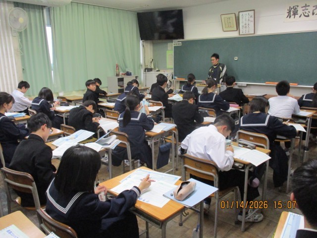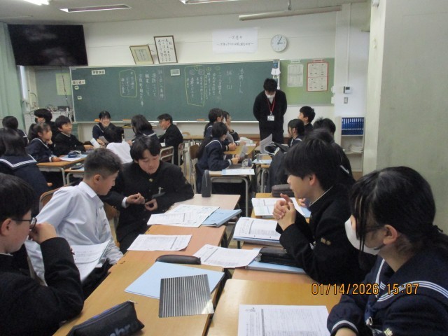 1年生は、「進路コンパス」を元に、将来の進路や仕事などについて話し合っています。各自が取り組んできた職業人調べについても紹介しています。