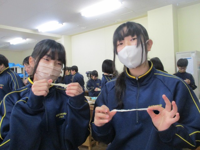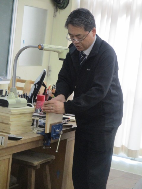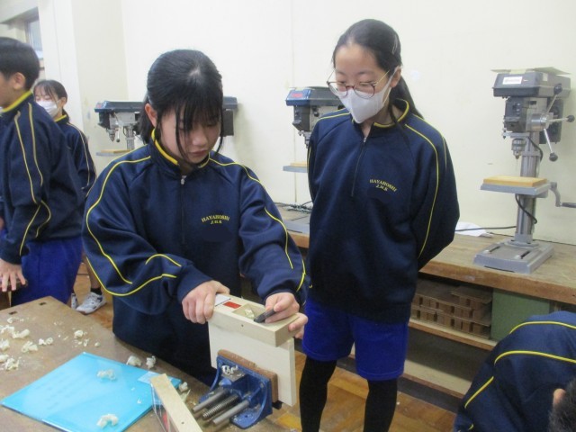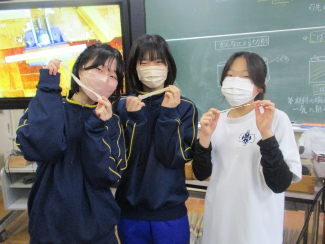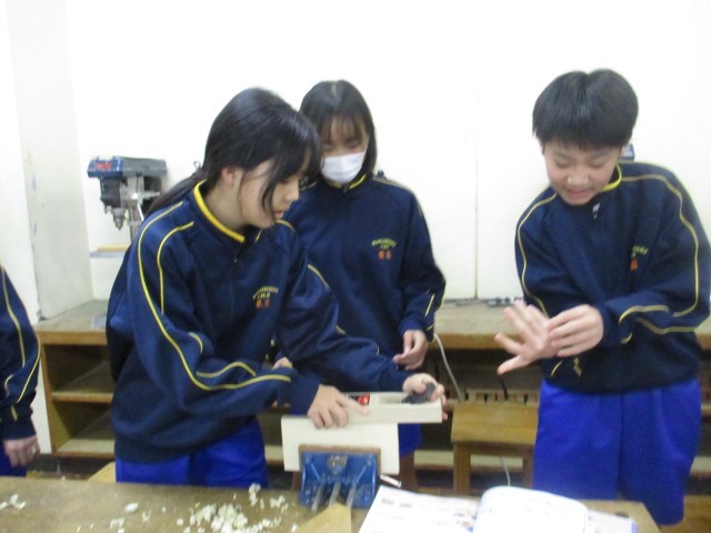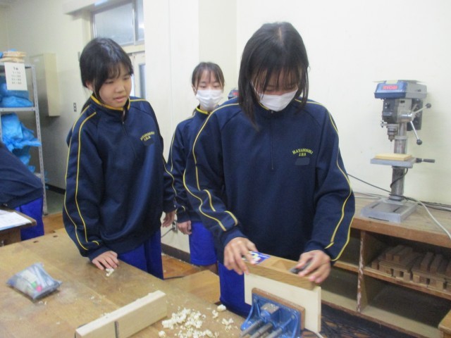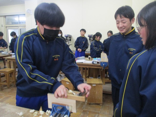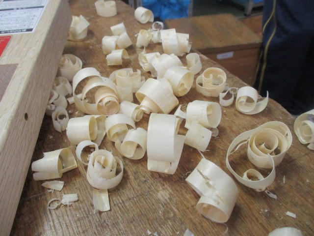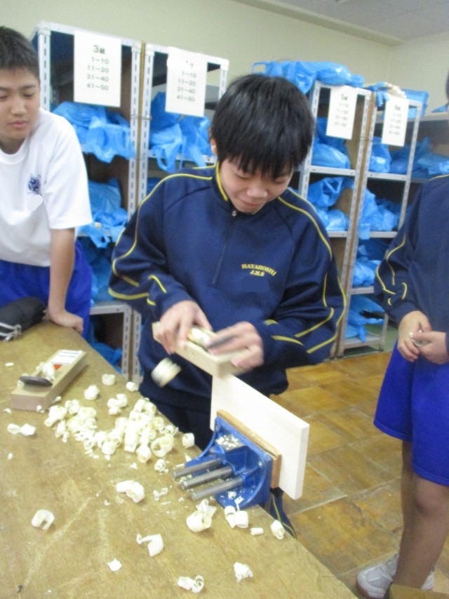 かんながけの授業の様子です。グループでアドバイスをしあったりして、交代で作業をしています。『普通のかんな』と『替え刃式かんな』の2種類のかんなの違いを感じ取っています。上手に削れた生徒たちは、満面の笑顔です。