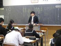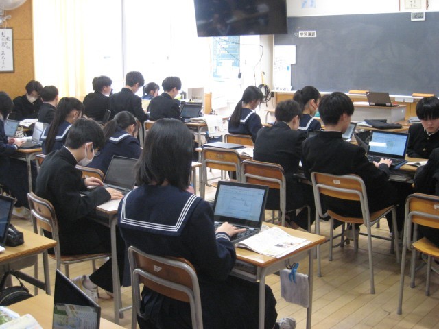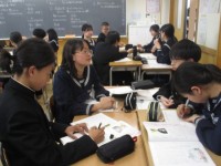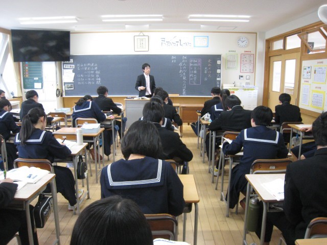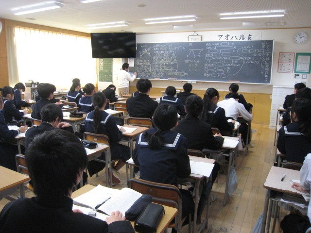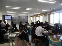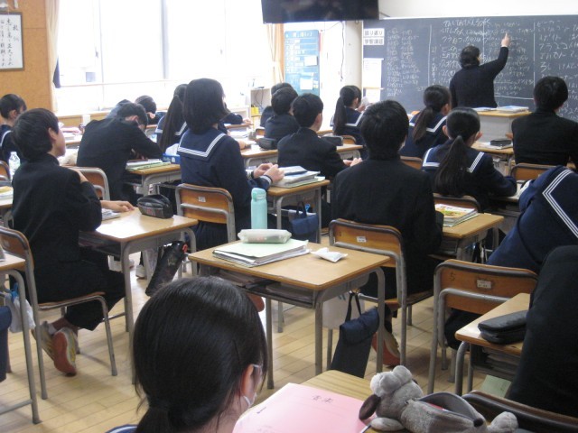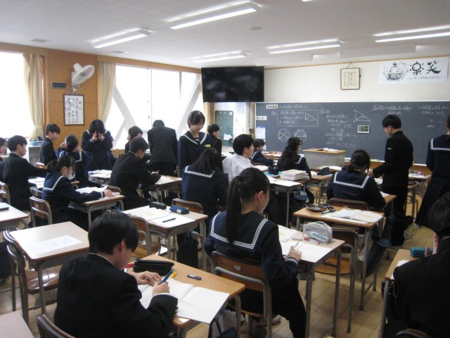 写真は、上から1組数学、2組理科、3組理科、4組社会、5組国語、6組数学、7組・8組保健体育の授業の様子です。