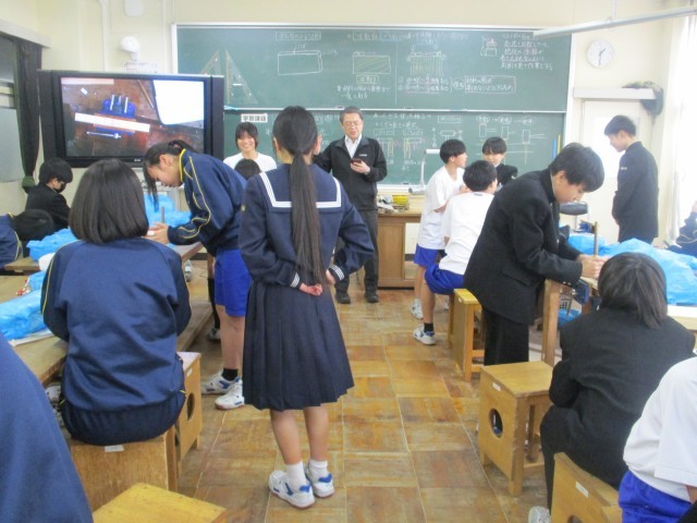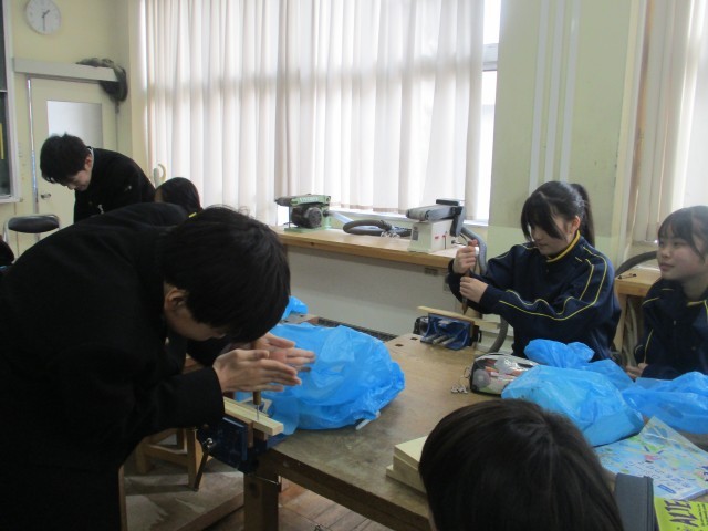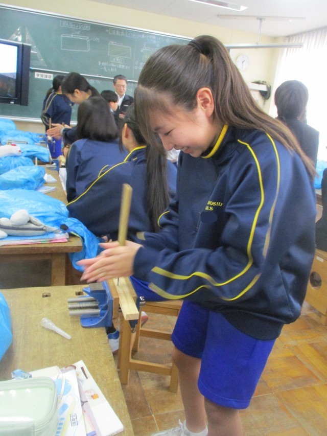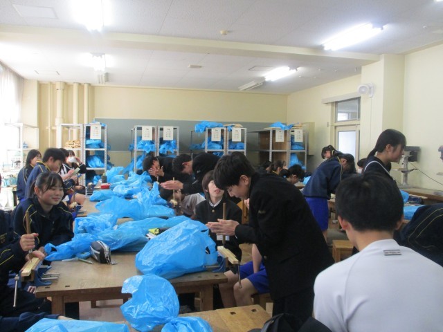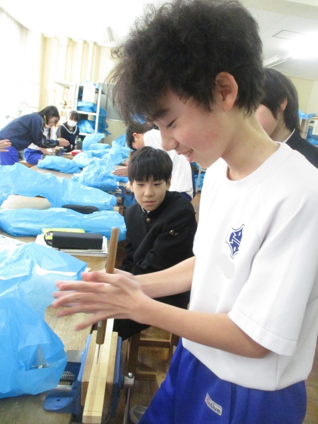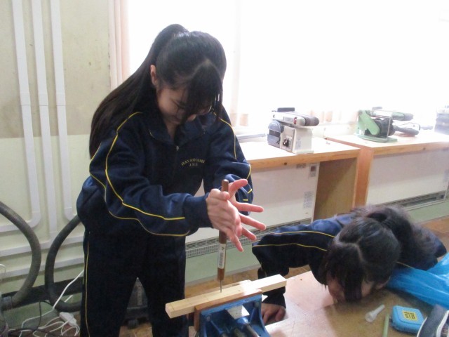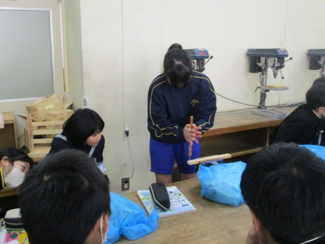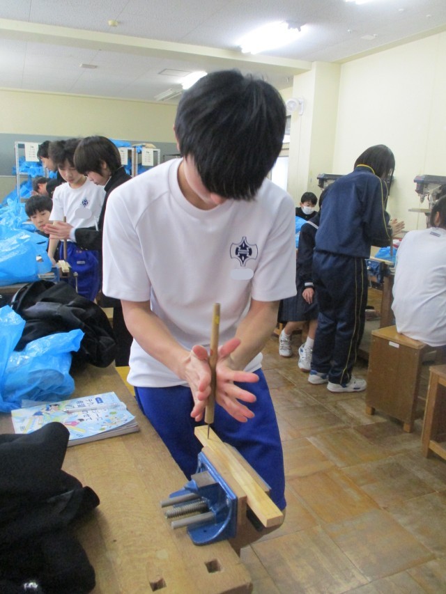 1月21日(水) 1年生 技術科(キリ) 公開日 2026/01/21 更新日 2026/01/21 1年生 技術科では、『キリ』の使い方を実習しました。キリの種類や使い方の注意点、コツなどを聞いた後、実際にキリで穴をあけてみました。大部分の生徒が1分以内に穴をあけることができていました。 +7