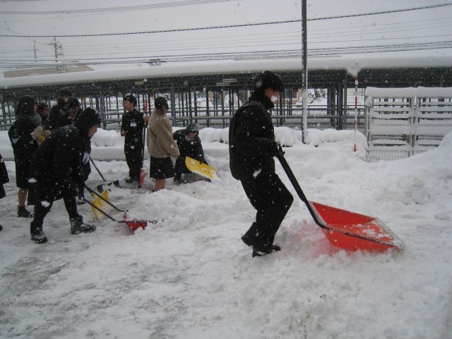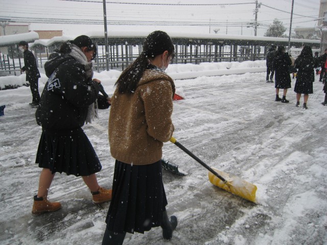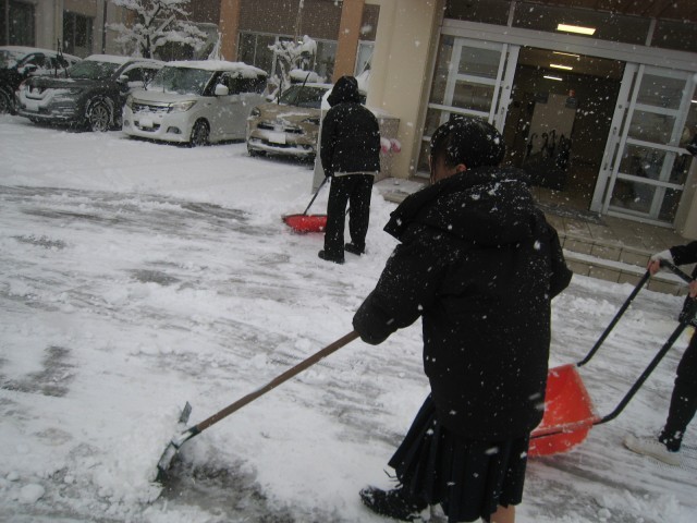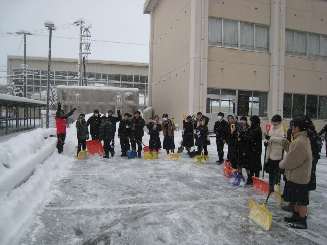 生徒玄関前の雪がなくなるまで、声を掛け合いながら、みんなで協力して除雪に取り組みました。