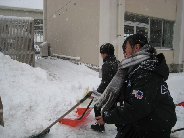 冷たい雪で手が赤くなりながらも、一生懸命頑張ってくれたおかげで、生徒玄関前は安心して通れるようになりました。