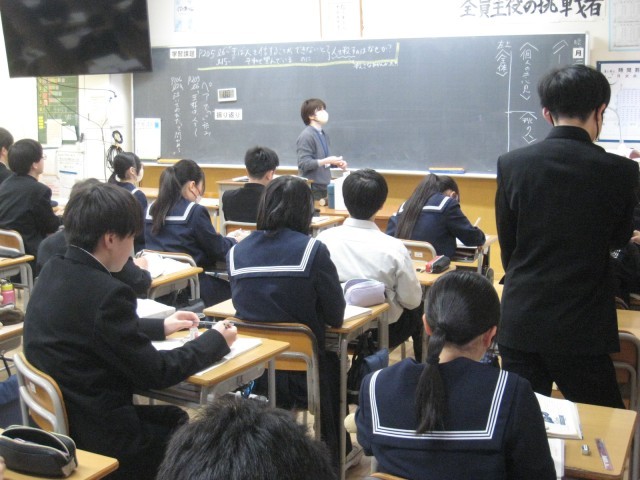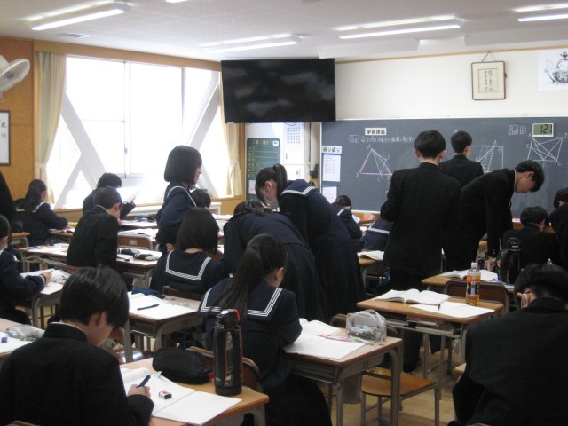 写真は、上から1組・2組保健体育、3組国語、4組国語、5組社会、6組数学、7組英語、8組理科の授業の様子です。