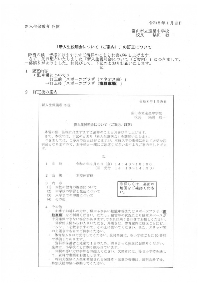 さて、本校では2月6日(金)の午後に、今年度の「新入生説明会」を開催します。詳細については、「『新入生説明会(ご案内)』の訂正について」と「駐車場」を掲載しました。今後、変更等がある場合、HPに随時アップしていきますので、ご確認ください。よろしくお願いします。