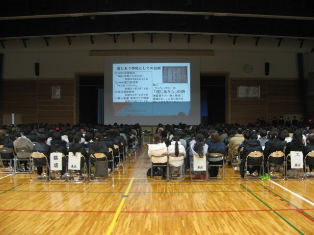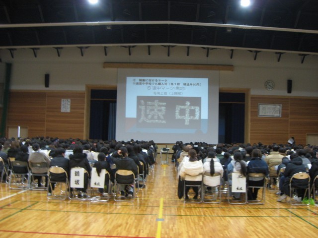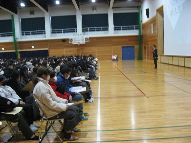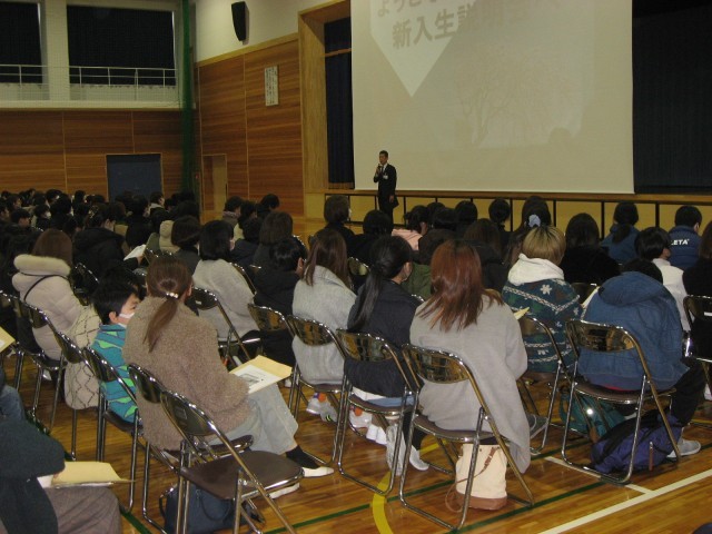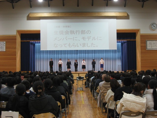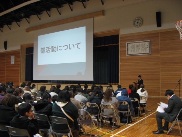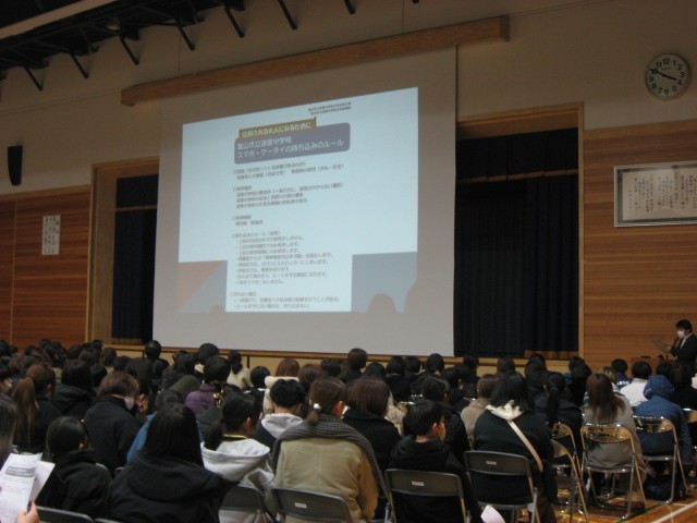 本日、新入生説明会を行いました。中学校での学習・生活の様子や、部活動について、担当者より説明を行いました。生徒会執行部の生徒からは、制服の紹介や、中学校入学前の不安についてのアドバイスがありました。また、警察の方からは、スマホ・SNSとの上手な付き合い方についてお話をしていただきました。