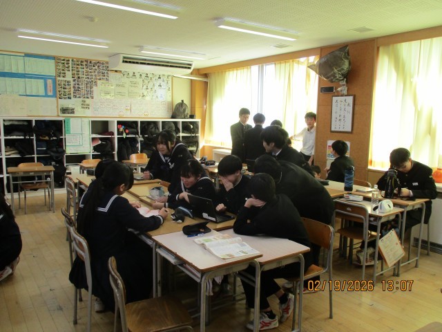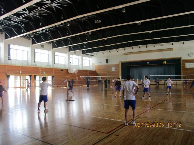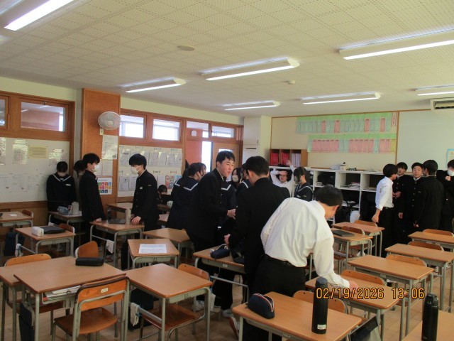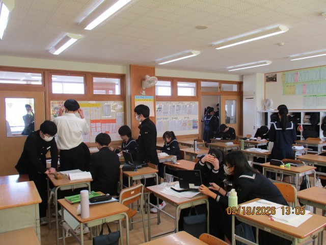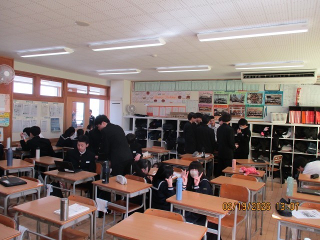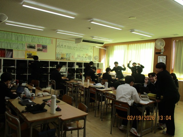 3年生の昼休みの様子です。それぞれリラックスしながら友達の会話を楽しんでいます。中には勉強を教え合ったり、黙々と学習をこなしている生徒もいます。7、8組は昼休みを利用して、体育の前のウォーミングアップに体を動かしています。