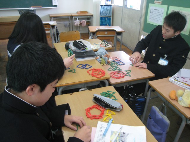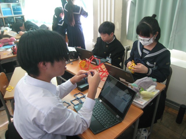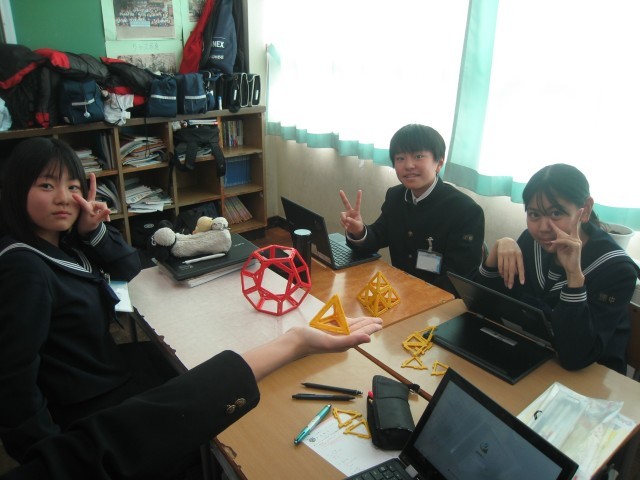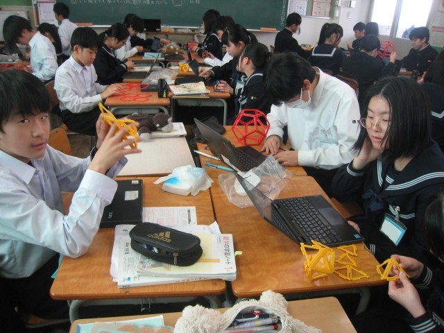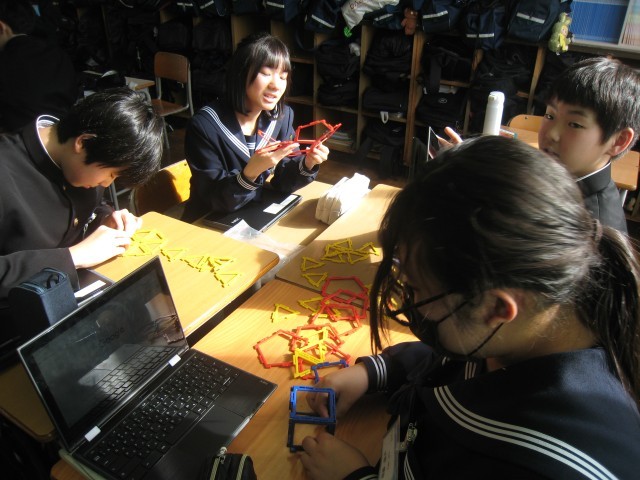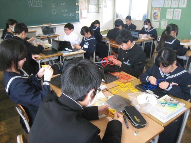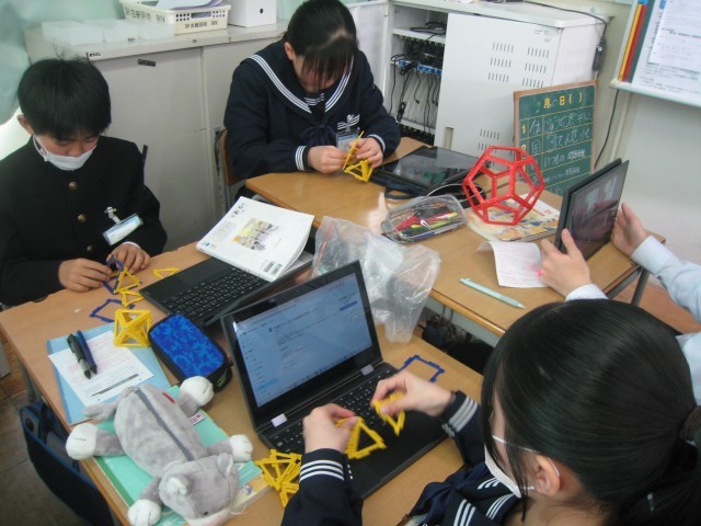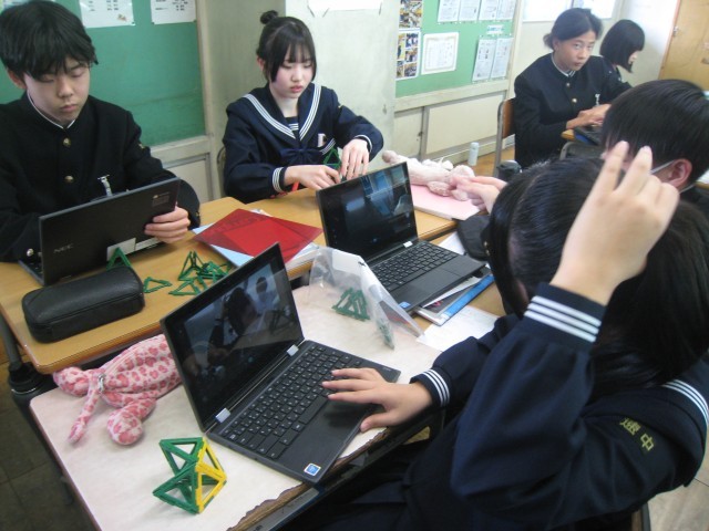 数学の授業では、立体的な感覚を養うために『ポリドロン』というパズルを行っています。自分が作った立体をクロムブックで撮影しアップロードして、授業の中で紹介しあいました。