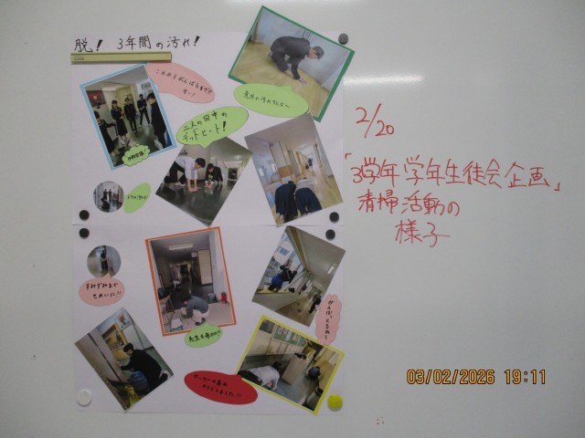 2月20日に3学年生徒会企画の清掃活動を実施しました。その様子が分かる掲示物を職員室前に掲示しました。日頃の感謝を込めて、校舎を丁寧に清掃してくれた様子が伝わってきます。ぜひご覧ください。