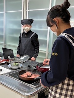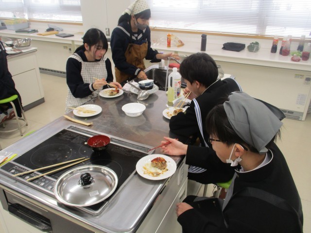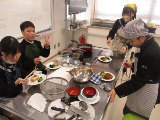 1年生では、2回目の調理実習が行っています。今回の実習はハンバーグです。ハンバーグを作り、プラス1品を考えています。ハンバーグの上にチーズを乗せているグループもあり、どのグループもおいしそうに仕上がりました。