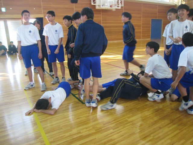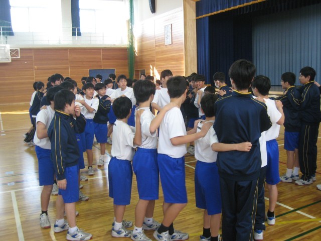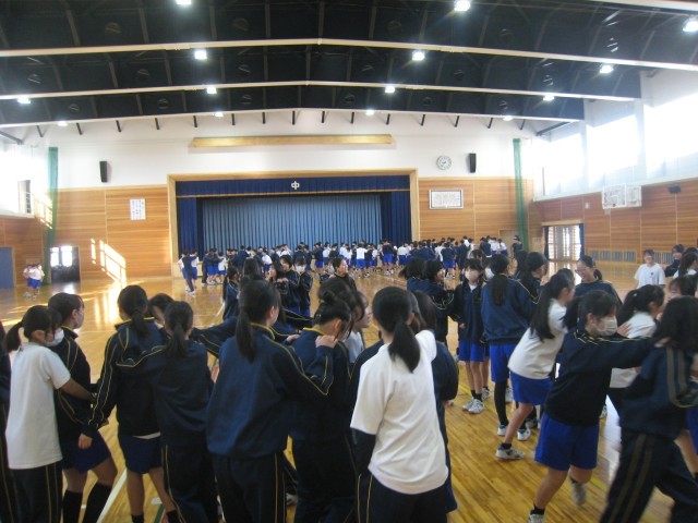 学年レクリエーションの最初の種目は、『貨物列車』です。じゃんけんをして負けた人が勝った人の後ろについていき、勝った人の列がどんどん長くなっていくゲームです。ゲームの最後には、男子の一番の勝者と女子の一番の勝者がじゃんけんをしました。その結果は、女子の勝利でした。男子が、本当に残念がっていました。