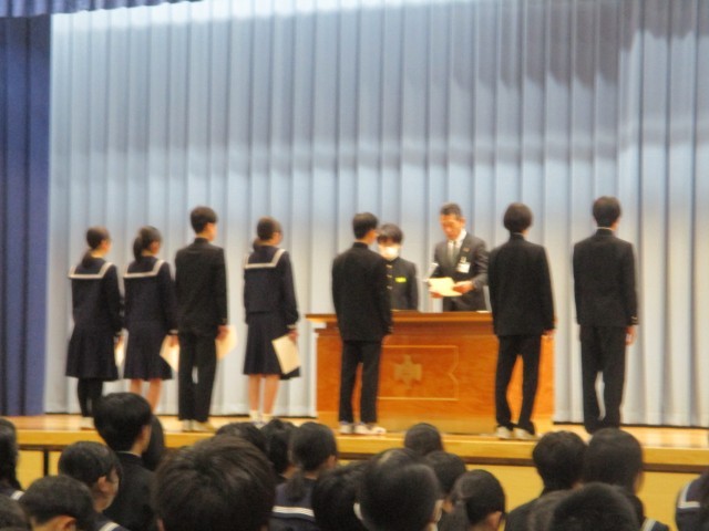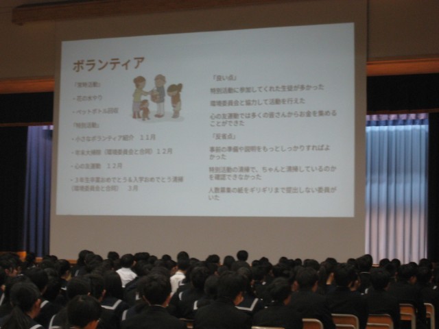 後期生徒会活動の振り返りを行いました。活動を通してよかったことと、課題を全校で共有し、次の活動につなげていきます。また、後期生徒会から前期生徒会に引継ぎを行い、その後新生徒会長から委員長の任命式を行いました。