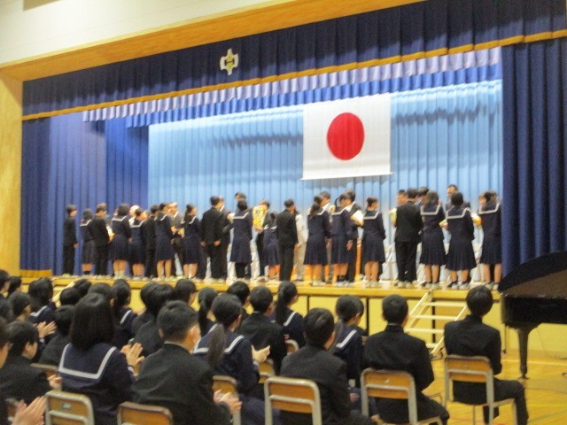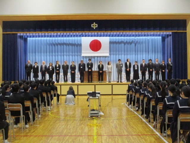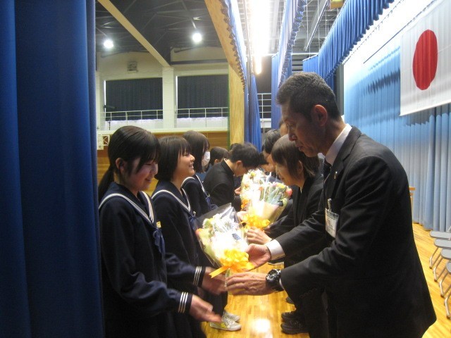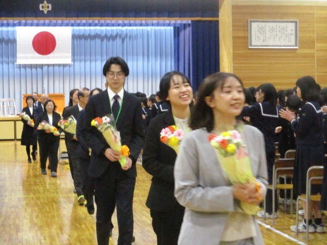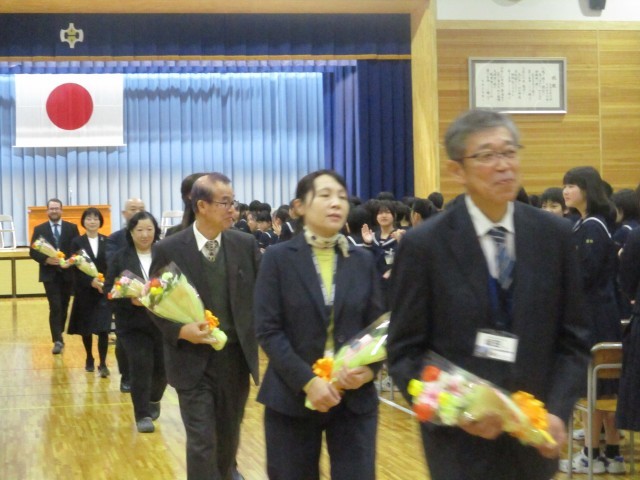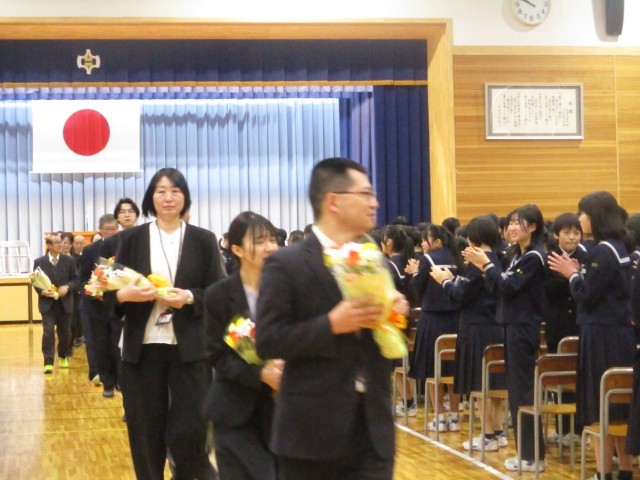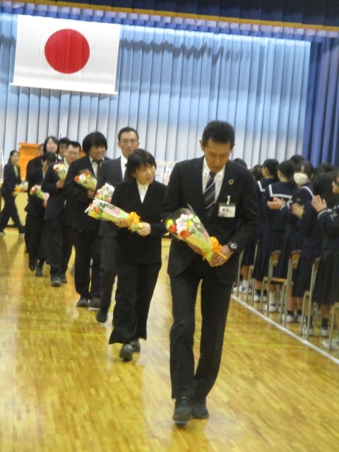 修了式終了後、異動が決まった19人の先生方の離任式をを行いました。一人一人の先生方からお言葉をいただき、生徒代表が謝辞を述べるとともに花束贈呈を行いました。お世話になった先生方ありがとうございました。