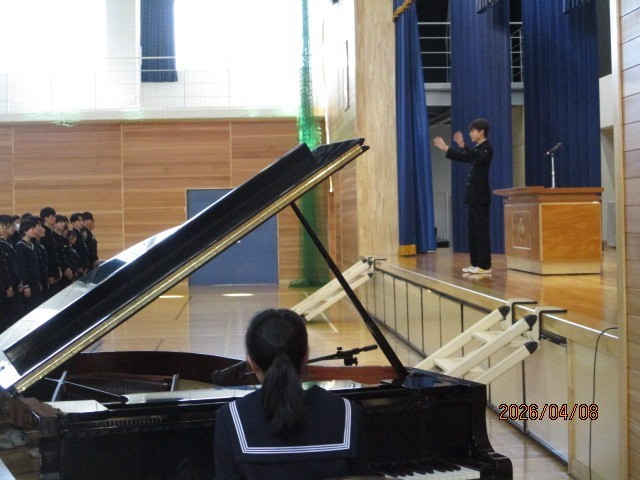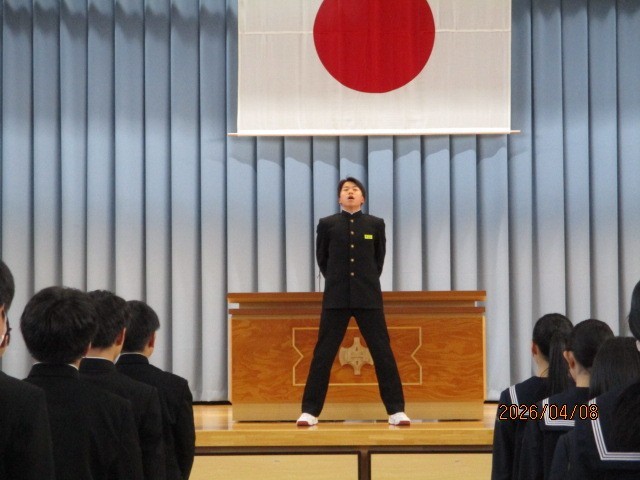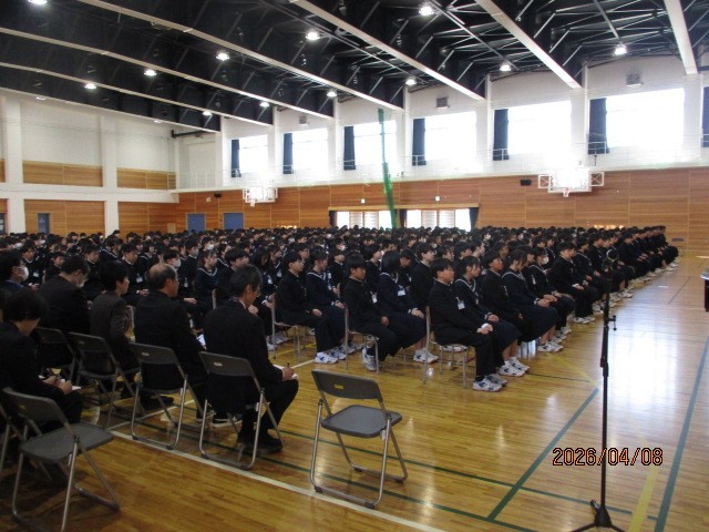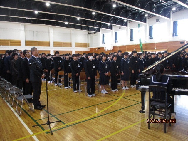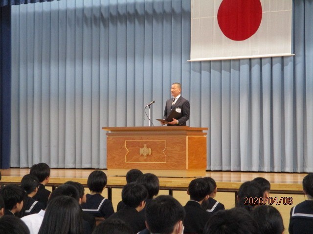 令和8年度1学期始業式を行いました。開式の前に校訓唱和を行います。式後、池淵校長の式辞がありました。式辞では「自分を大切にすること」で自分を磨き、輝かせてほしいと述べました。担当教職員の発表後、校歌を斉唱して終わりました。生徒は新しい年度を迎え、新たな気持ちで様々なことに取り組んでほしいと思います。