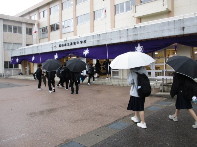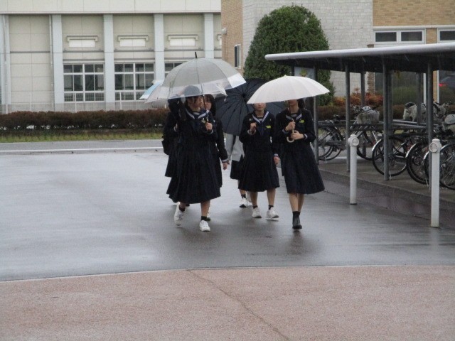 今朝の登校時は雨になりました。今日は第80回入学式を行います。本日の下校完了時間は11:45です。