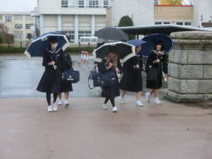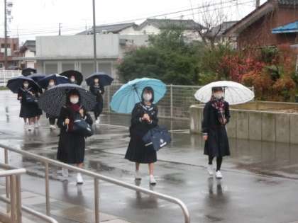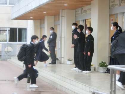 11月最後の日は、肌寒い雨。にも関わらず、生徒達は元気に登校しました。玄関では、生活向上委員会の2年生が爽やかな挨拶で全校生徒を出迎えました。