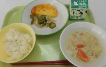 ごはん 白インゲン豆のシチュー オムレツ 茎ワカメサラダ 牛乳
