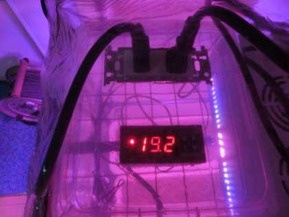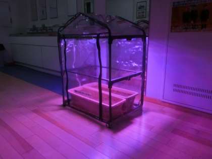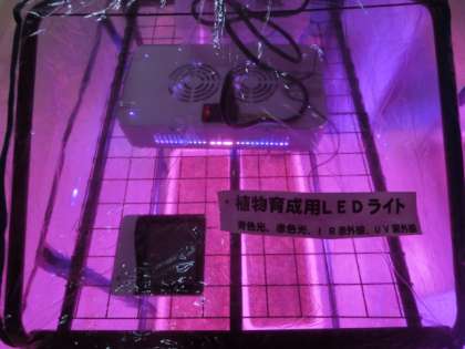 特性ハウスができあがりました。LEDライト(赤外線含む4色LED)と育苗用マットヒーターを自作サーモスタットに接続し、ハウス内の温度を一定に保っています。23度以上になるとOFF、18度まで下がるとONになるという仕組みです。