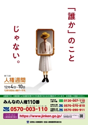 そこで、本年も、12月4日〜12月10日までの1週間を「第72回人権週間」と定め、様々なメディアを利用しつつ、全国各地において集中的に人権啓発活動を行います。