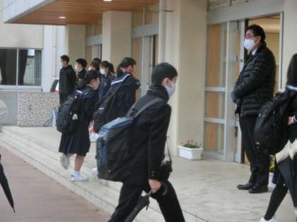 新しい週の始まりは、雨。肌寒い朝でしたが、生徒たちは元気に登校しました。玄関では、生活向上委員会の3年生が、爽やかな挨拶で全校生徒を出迎えました。