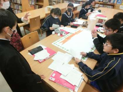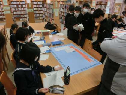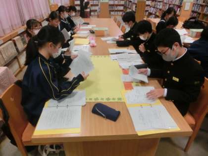放課後、臨時の図書委員会を開きました。全校生徒が図書室にある本や漫画の中から抜き出した名言を委員で選別し、掲示物を作成しました(上段:1年、中段:2年、下段:3年)。作成した掲示物は、図書室内にて掲示します。