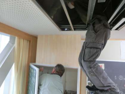 先週から、体育等の移動教室時を見計らってA棟の普通教室に、大型モニター用の台を設置しています。