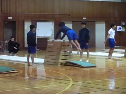 下段は3年男子の体育です。補助を必ず付け、安全面に配慮しながら跳び箱をやっています。
