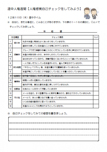今日は、速中人権週間最終日。これまでの活動を経ての現時点での人権感覚を自己チェックし、感想を書きました。今回身に付けた人権感覚を、風化させることなく今後の生活に生かしていってほしいと願っています。