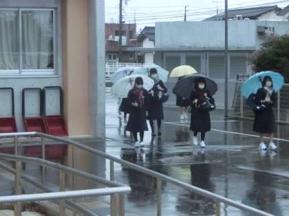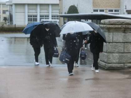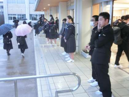 予報通り、冬の到来を感じさせる寒さ。理科室横には、スノーダンプが設置されました。玄関では、生活向上委員会の1年生が、爽やかな挨拶で全校生徒を出迎えました。