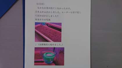 なかなか発芽しないので、土をほぐしました。ヒーターを追加して、降雪の寒さにも耐え得るようにしました。水栽培も始めました。