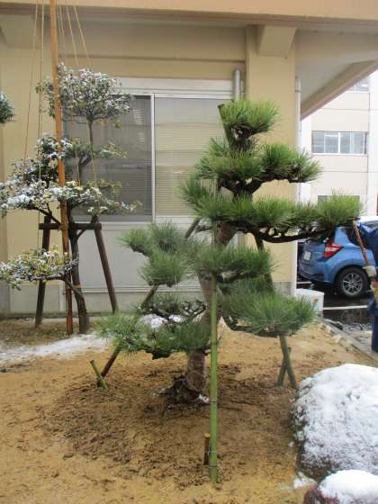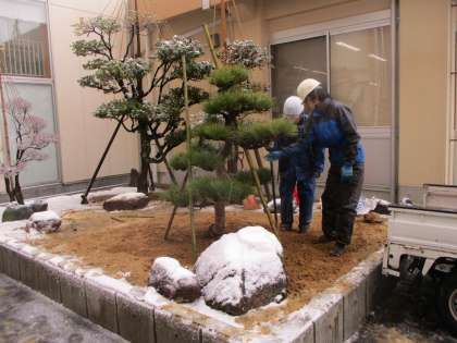 積雪がありましたが、土壌改良した後、丁寧に植えられました。今回植樹した黒松は、2年間の保証が付いているため、今後2年の間に枯れたり弱ったりした場合には、いつでも診察して手当てしていただけることになっています。