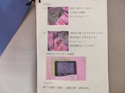 LEDで人工的な太陽を作り出しています。100均で買ったプラスチックの箱を改造して作りました。廊下は3度ですが、ハウス内は約15度、湿度65%と快適な環境を保っています。