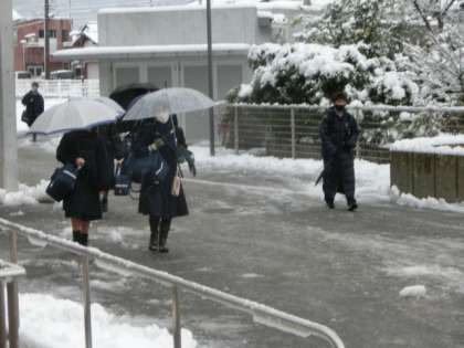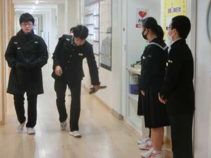 積もった雪が溶けてシャーベット状になっている道を歩いてくる生徒たちは、今日も元気いっぱいでした。玄関では、生活向上委員会の1年生が爽やかな挨拶で全校生徒を出迎えました。