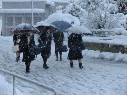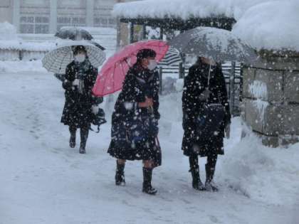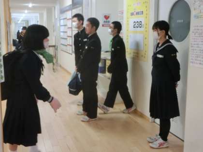 登校時、あちこちの歩道で除雪機を見かけるほど降りましたが、生徒たちは元気に登校しました。玄関では、生活向上委員会の1年生が爽やかな挨拶で全校生徒を出迎えました。