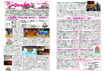 1学年だより第14号をアップしました。内容は、学年主任の巻頭言、特技披露生徒の紹介、学年集会(「帰れま20」「特技披露」)を終えての生徒作文、情報モラルを終えての生徒作文、今後の予定です。