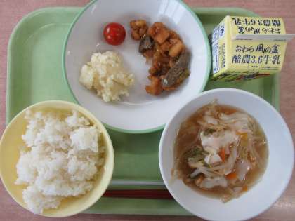 ごはん 鶏肉とレバーの香味ソース チーズポテト ミニトマト ワンタンスープ 牛乳