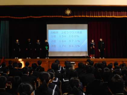 1年生は、1限に学年集会を行いました。最初に、学力向上プロジェクトの一環である「合格するまで帰れま20」の結果を学年生徒会が発表しました。