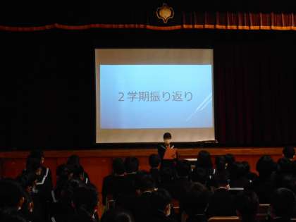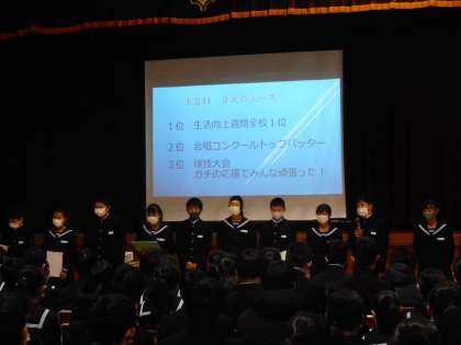 次に、各クラスの代表が「クラスの3大ニュース」を発表しました。最後に、学年生徒会の代表が2学期を振り返りました。