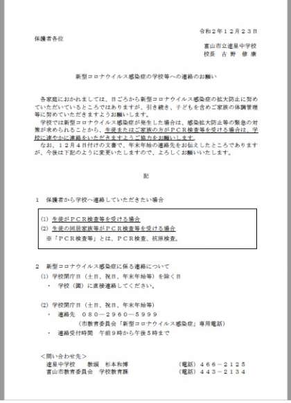 12月24日(木) 【12/23配布】 新型コロナウイルス感染症の学校等への連絡のお願い