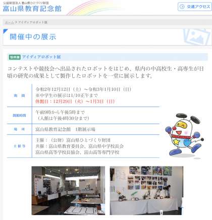 アイデアロボット展が、富山県教育記念館1階で、12月12日(土)〜1月10日(日)まで行われています。本校コンピュータ部が県ロボコン大会で受賞した3体が展示されています。