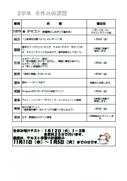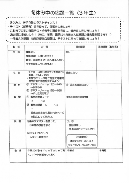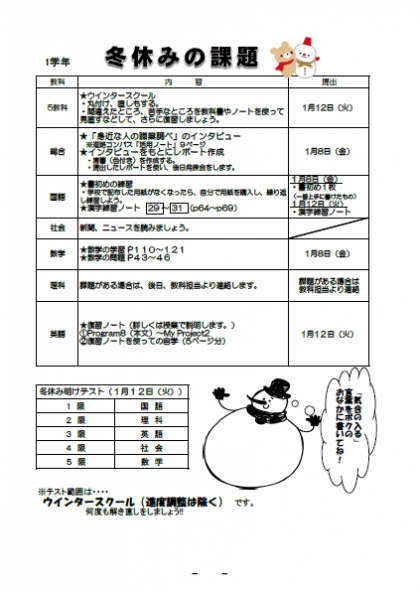 冬休みも、残すところ今日を含めて3日となりました。既に課題を終わらせてしまっているかもしれませんが、念のために貼り付けておきます。併せて、冬休みのしおりの未記入箇所があれば、そちらも完了させてください。