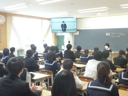 【今回から初めて、被服室から全教室の大型65インチモニターにライブ配信されました。音声は、校内放送を利用し、映像はライブ配信システムを使っています。】