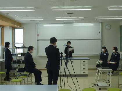 今回から、初めて被服室から全教室の大型65インチモニターにライブ配信されました。音声は、校内放送を利用し、映像はライブ配信システムを使っています。
