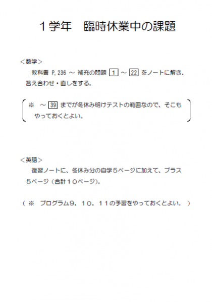 1月13日(水) 臨時休業中の課題について(お知らせ)