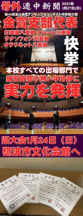 速星中学校は、打楽器8重奏、フルート3重奏、サクソフォン5重奏、クラリネット8重奏の4チーム「すべて」金賞並びに富山支部代表に選出されました。