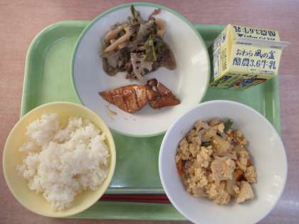 ごはん、厚揚げの卵とじ 蓮根の香り炒め、ふくらぎの照り焼き、牛乳