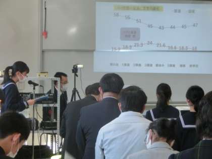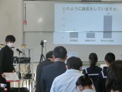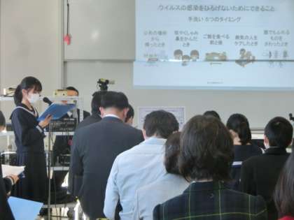 保健委員が「新型コロナウィルス感染予防の基本」というタイトルで、プレゼンテーションソフトや動画を活用し、手洗いのタイミング、咳エチケット、3密回避、換気の実態と加湿対策、差別・偏見の根絶等、様々な観点から発表を行いました。