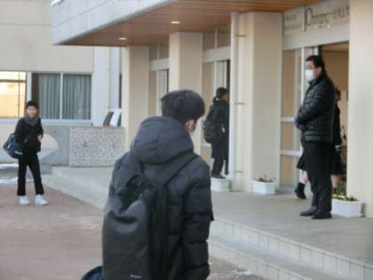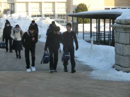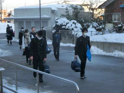 今朝も氷点下で路面はツルツルでしたが、生徒たちは足下に注意しながら元気に登校しました。