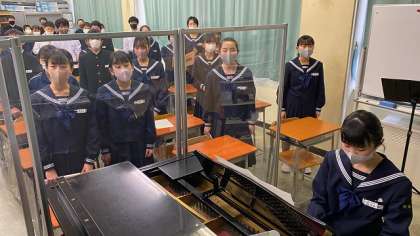 新入生説明会用の学校紹介資料として、1年生有志による校歌紹介をビデオで行います。今日は。その1回目の練習でした。収録本番に向けて、堂々と歌うことができるよう練習を重ねていきます。