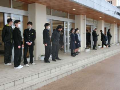 週の始め。寒さも和らぎ、生徒たちは元気に登校しました。玄関では、生活向上委員会の3年生が、爽やかな挨拶で全校生徒を出迎えました。
