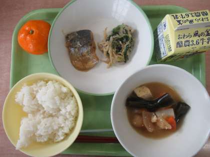 ごはん さむらいのおでん 鯖の味噌煮 ゴマ和え みかん 牛乳
